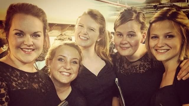 Image left to right: Freya, Vicki, Becky, Ruth and CJ backstage before NYCOS performed Mozart Requiem at the BBC Proms in 2014.